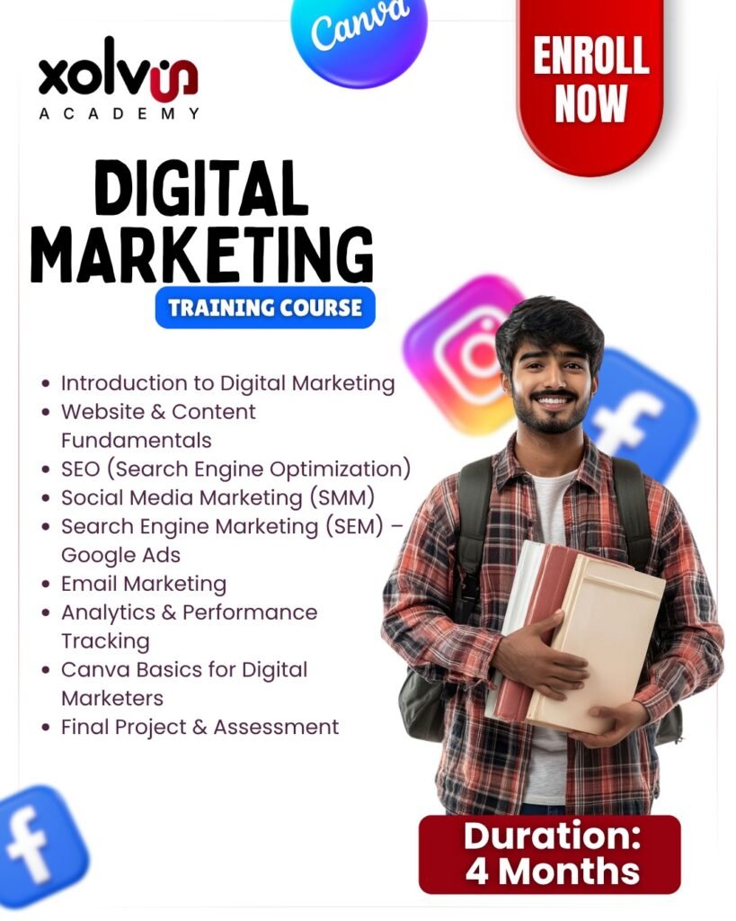 The Digital Marketing Course at Xolvin Academy is a hands-on, career-focused training program that covers everything from SEO and Social Media Marketing to Google Ads, Email Campaigns, and Analytics.