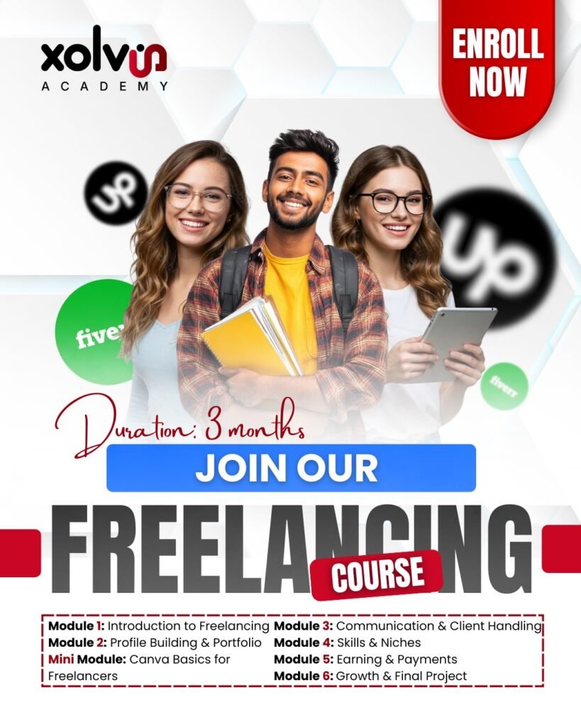 If you’ve ever dreamed of working independently, earning online, or building a career on your own terms — the Freelancing Course in Karachi by Xolvin Academy is your gateway to success. This program is designed for students, professionals, and anyone who wants to master freelancing from scratch and start earning through global platforms like Fiverr, Upwork, and Freelancer.